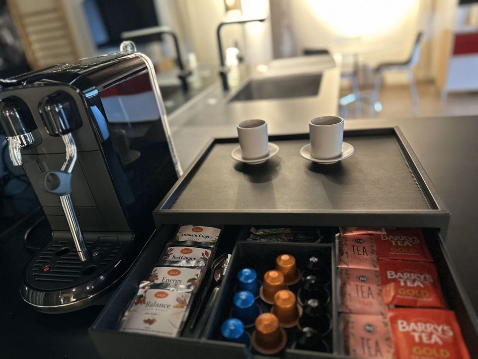 Gut ausgestattete Minibar mit Kühlzone, Heissgetränke-Bar mit Kaffees, Tees, Jamus sowie Vitamin-Corner mit infused Water, frischem Obst, Gemüse: alles zu Ihrer freien Verfügung.